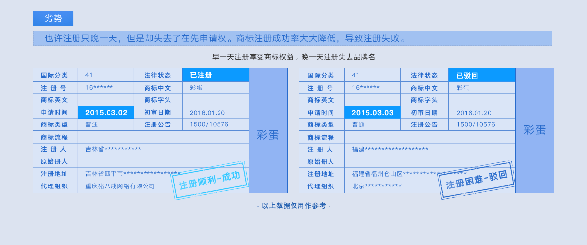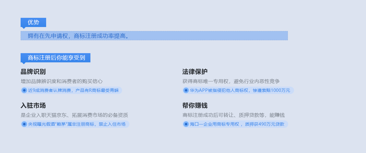 Q1 商标注册成功率如何估算? 获取解答 Q3 商标被别人注册了怎么办? 获取解答 Q2 怎么选择商标的行业分类? 获取解答 Q4 商标起名应该注意一些什么? 获取解答